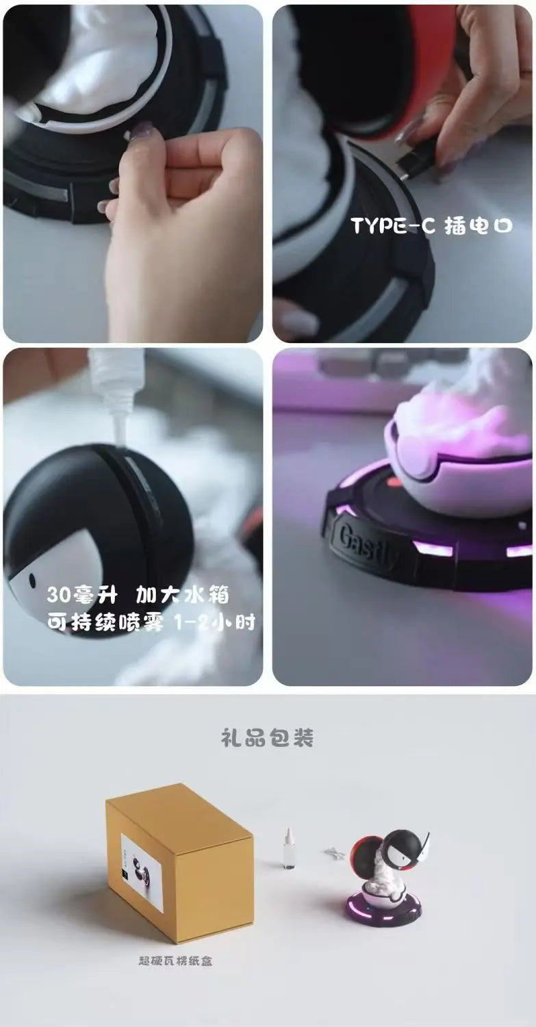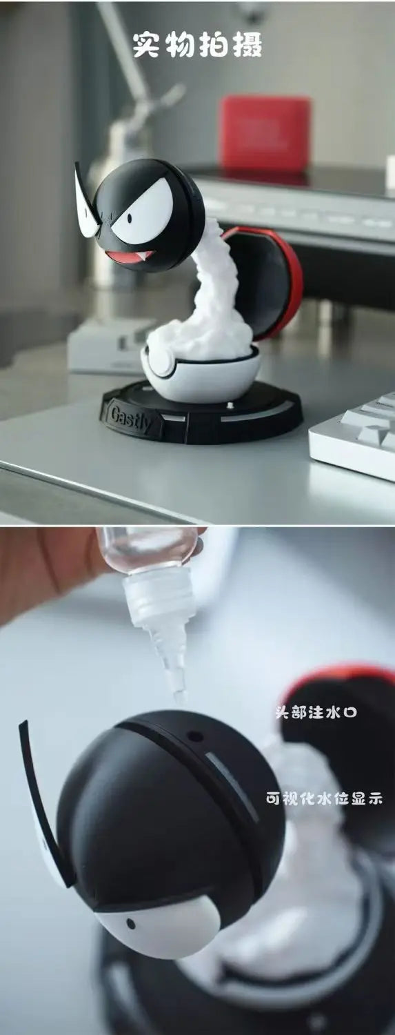 Witness the captivating spectacle as this meticulously crafted Gengar figure perches atop its Poké Ball-inspired plinth. Activate the device to experience a truly ethereal ambiance. A gentle, incandescent purple glow emanates from the base, casting spectral highlights throughout your room. Simultaneously, a mesmerizing, nebulous mist unfurls, swirling around the phantom figure, evoking the very essence of its ghostly powers.